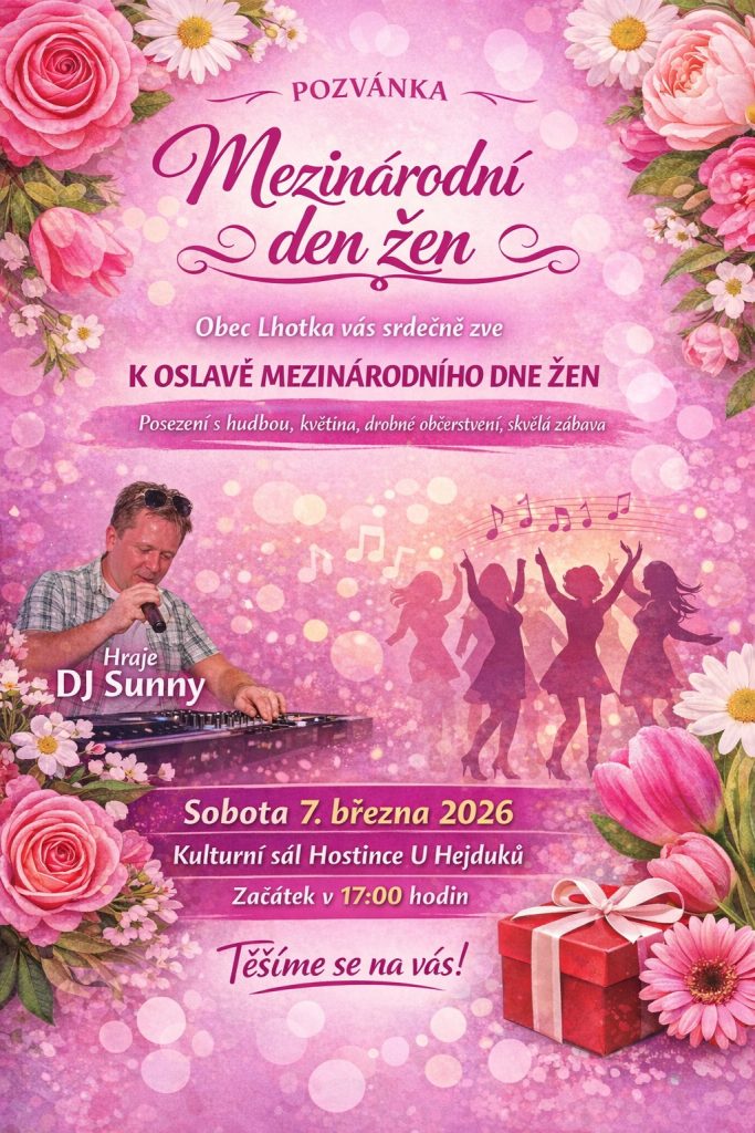 🌸 Obec Lhotka vás srdečně zve na oslavu Mezinárodního dne žen, která se uskuteční 📅 v sobotu 7. března 2026 od ⏰ 17:00 hodin 📍 v kulturním sále Hostince U Hejduků. Těšit se můžete na 🎶 příjemné posezení s hudbou, 🌷 květiny, 🍰 drobné občerstvení a o skvělou zábavu se postará 🎧 DJ Sunny. 💃 Těšíme se na vás!